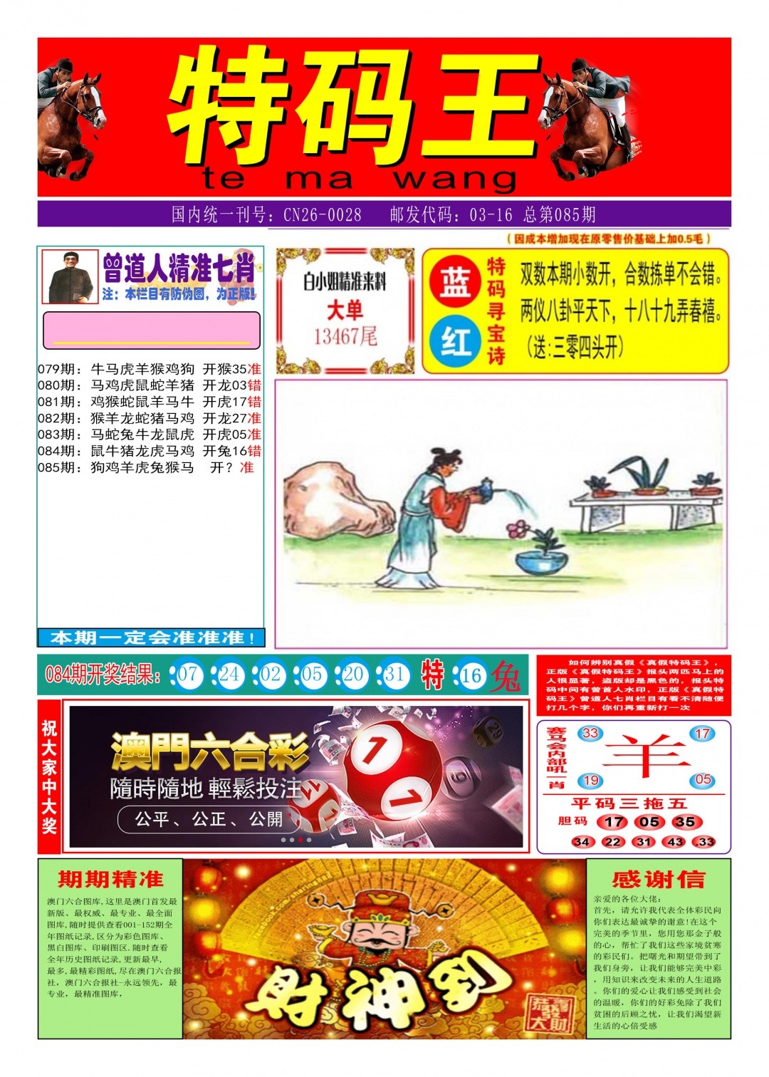 平特春联:085期澳彩之家【单双中特】